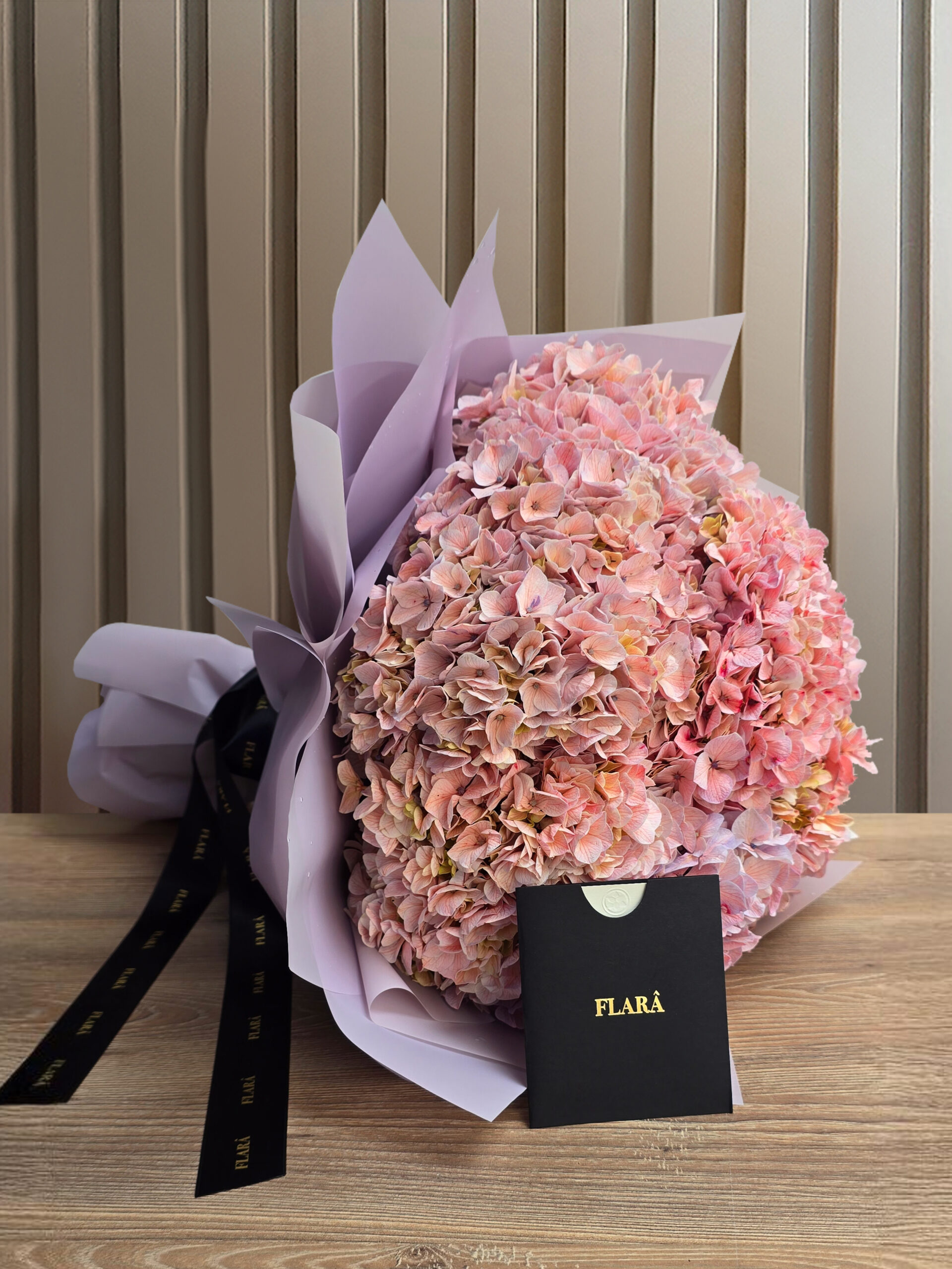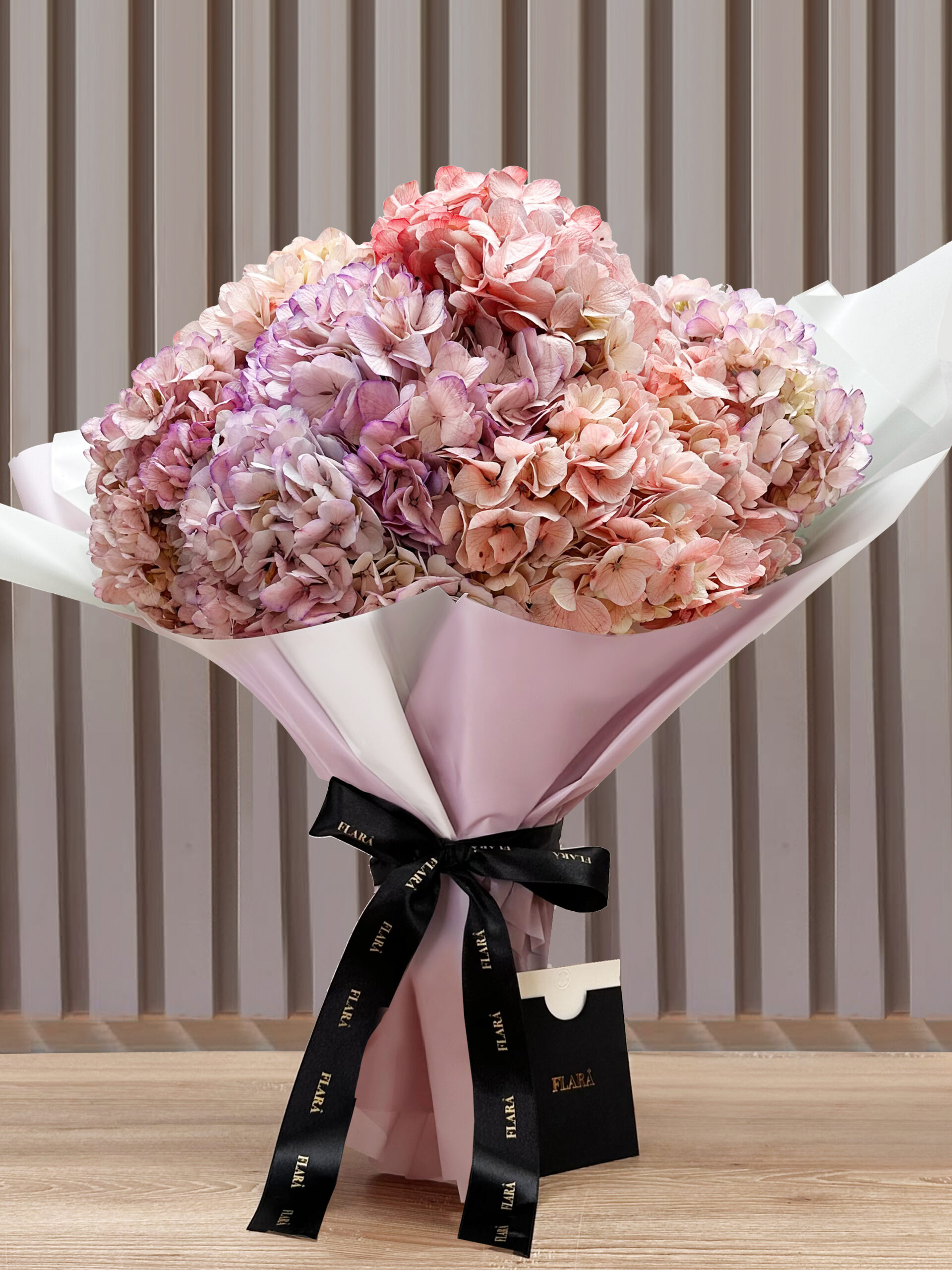 El ramo Eloise es una expresión de suavidad y sofisticación, compuesto por hortensias naturales en una variedad de colores que encantan: rosa, melón, lila, celeste y blanco.